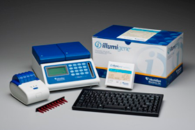 illumigene® Group A Strep Assay Work Flow: The illumigene® Group A Strep assay involves a simplified workflow for ease of use. Clinical throat swabs are placed in the sample preparation apparatus which contains the assay control. Sample is collected and heat treated at 95 C for 10 minutes. 50 uL of the heated sample are added directly to the test and control reaction beads. The device is placed into an illumipro-10 and results are automatically reported in 40 minutes. The work flow is outlined in Figure 1.